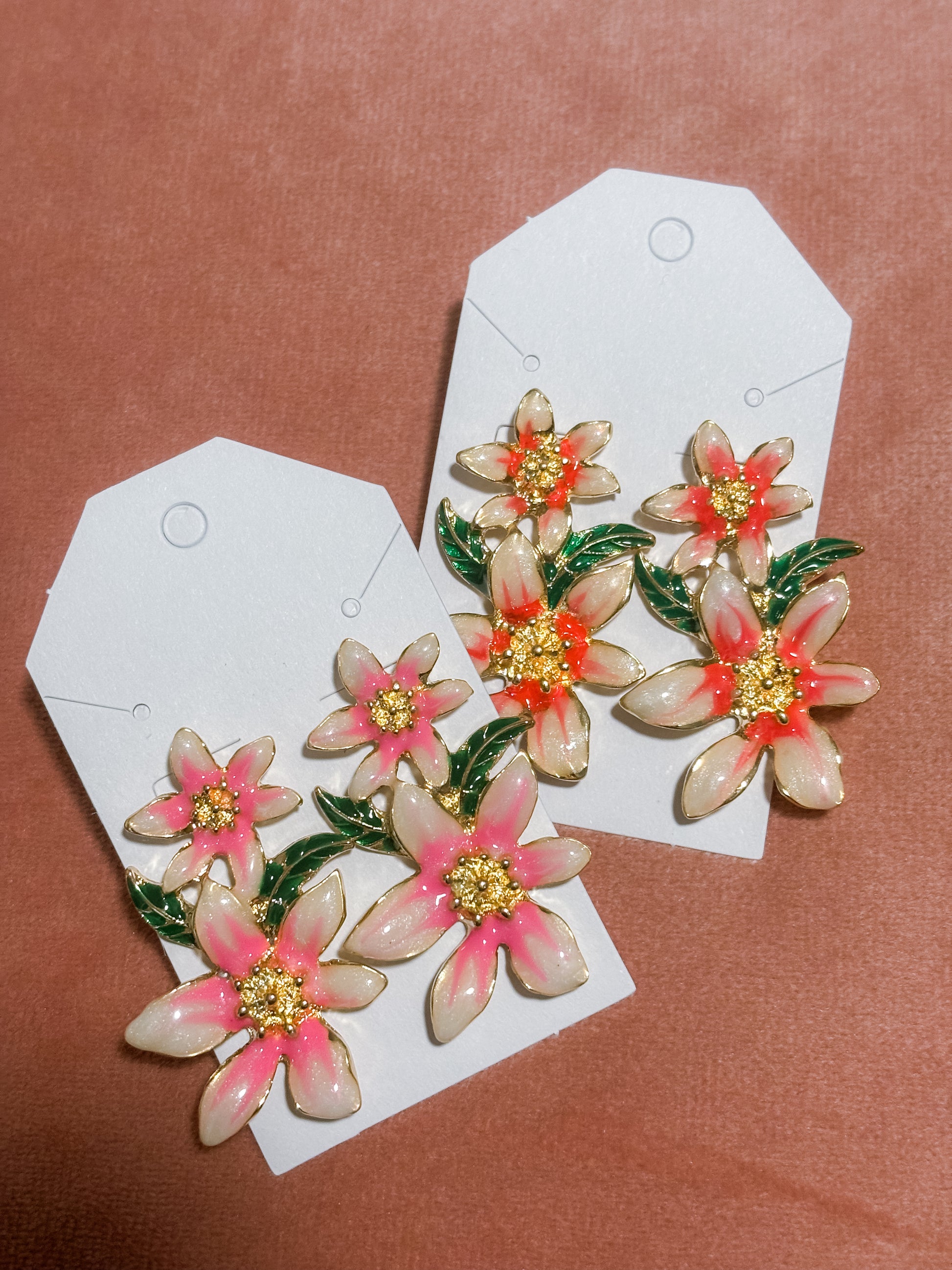 Add a pop of color with these lacquered pink flower drop earrings.